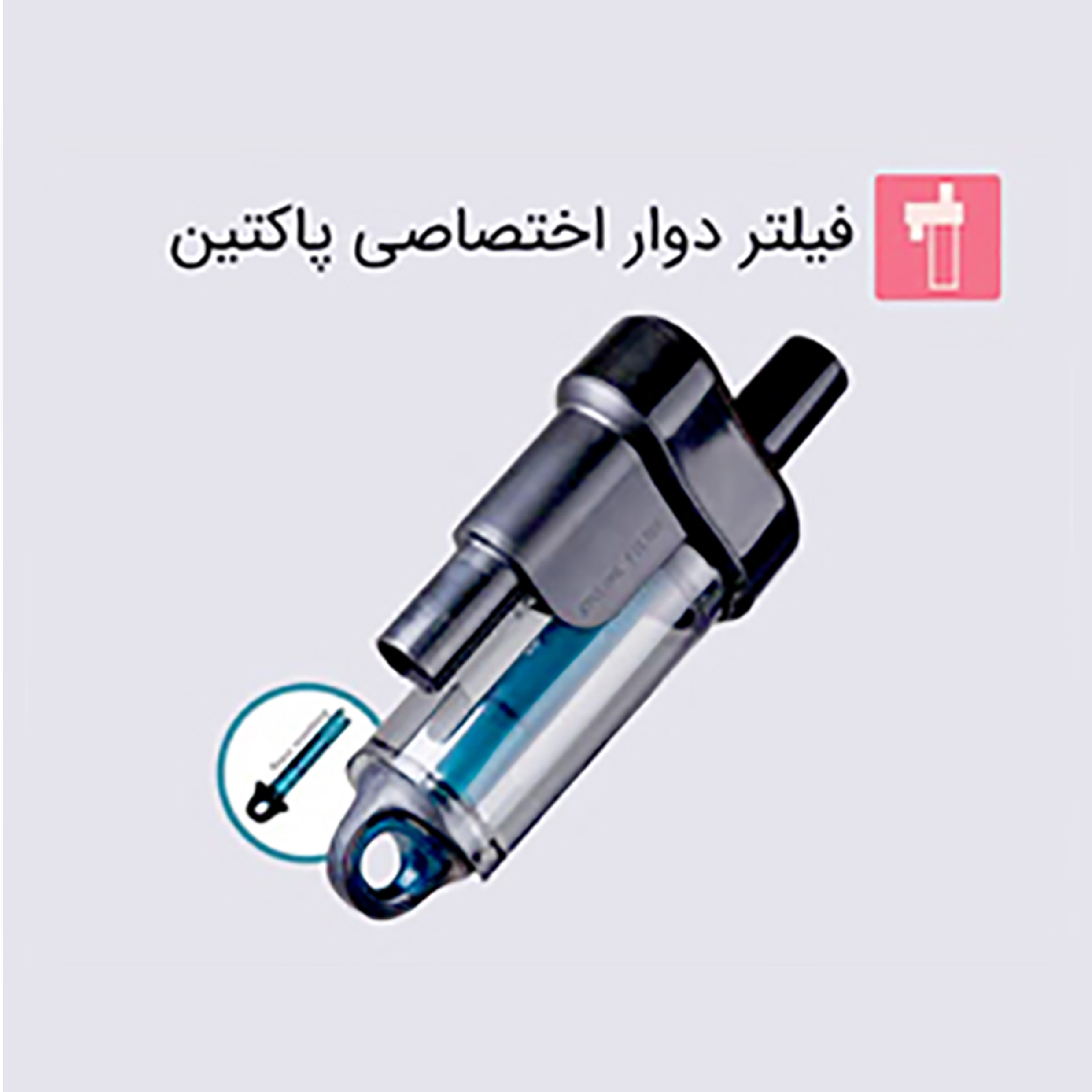 این جاروبرقی از پر فروش ترین تولیدات شرکت پاکتین می باشد و از موتور کمپانی AEG آلمان که بزرگترین کارخانه تولید موتور جارو برقی در اروپا است استفاده شده . موتور AEG پر بازده بوده و با مصرف برق پایین گرید A و مصرف انرژی آن در دور کم با 1400 وات و در دور ماکزیمم 2200 وات می باشد. توانایی مکش بسیار مناسب این مدل به حدی هست که توصیه می‌شود برای محافظت از فرش ها و جلوگیری از کنده شدن پرز آنها، از دور ماکزیمم استفاده نشود و فقط برای سطوح سخت یا موکت از دور ماکزیمم استفاده شود . فیلتر دوار نشکن : این فیلتر نقش مهمی در جارو دارد ، با نگهداری بخش زیادی از زباله ها ( شامل پرز قالی ، مو ، اشیاء ریزی که روی فرش افتاده و قابل مشاهده نیست و نمی توانید براحتی آنرا پیدا کنید و . . . ) مانع پر شدن کیسه جاروبرقی در مدت زمان کم می شود و تخلیه آن بسیار راحت تر از تخلیه کیسه جارو هست . اگر از کیسه های یکبار مصرف استفاده کنید بابت هر مرحله استفاده باید کیسه را عوض کرده و در صورت استفاده از کیسه های دائمی باید به سختی آنرا تخلیه نمایید. فیلتر دوار با به تأخیر انداختن زمان پر شدن کیسه هم در صرف هزینه کیسه یکبار مصرف و همچنین زحمت تخلیه کیسه دائمی و جلوگیری از استشمام گرد و غبار هنگام تعویض بسیار موثر است. دارای لوله کنفی مستحکم : در لوله های خرطومی معمولی شیارهایی وجود دارد که به غیر از جذب گرد و غبار محیط ، ظاهر زننده ای نیز دارد و میبایست به سختی کثیفی بین شیارها را تمیز نمایید . در ضمن گرد و غبار بواسطه لوله های خرطومی در فضای منزل جابجا می شود و از نظر بهداشتی نیز نگران کننده است .لوله کنفی در مقابل حرارت ، اصطکاک و خم شدن های مکرر مقاومت بیشتری دارد و به همین دلیل از طول عمر بیشتری برخوردار است .